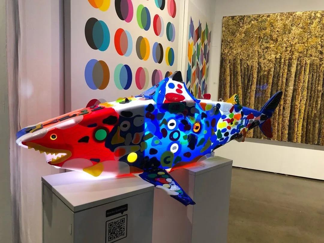 GAVRILOVIC’s visual style employs elements of comic book art, stained glass complexity, and saturated primary colors that showcase his finely tuned drawing skills. One is never done observing a work by Gavrilovic. The sheer detail of his work is borne of multiple sketches first in his artist’s journal which are then carefully recast to larger surfaces. The startling results depict friction between the coexistence of the natural world and the fabricated ones—both beautiful and reverent.